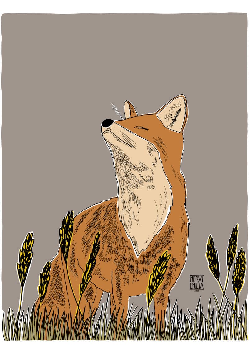 Happy Fox, colour block + line art illustration